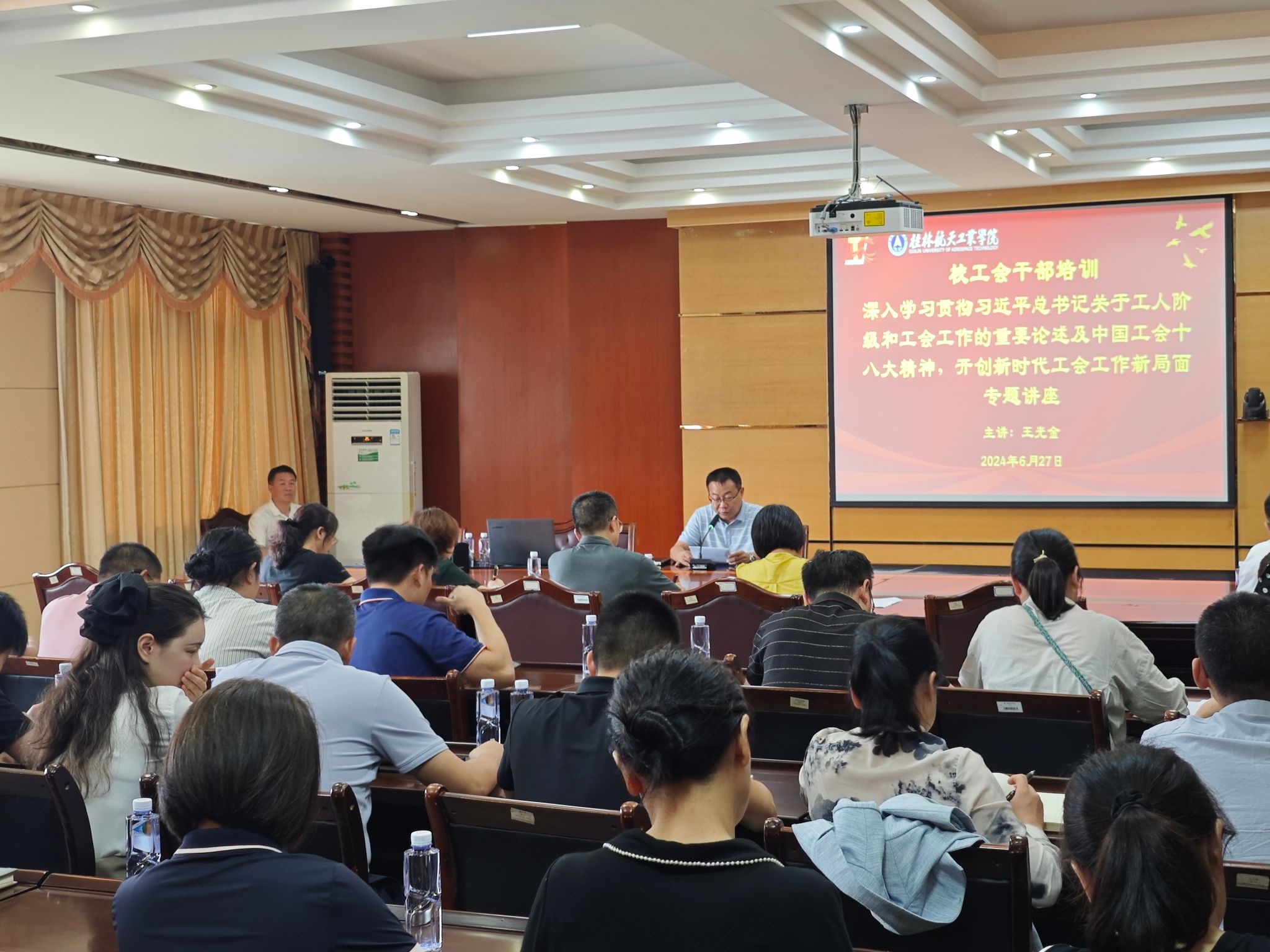 本次讲座特邀请原桂林市总工会二级调研员、桂林市教育工会主席、市职工大学客座教授王光金老师作《深入学习贯彻习近平总书记关于工人阶级和工会工作的重要论述和中国工会第十八次全国代表大会精神,开创新时代工会工作新局面》专题讲座。
