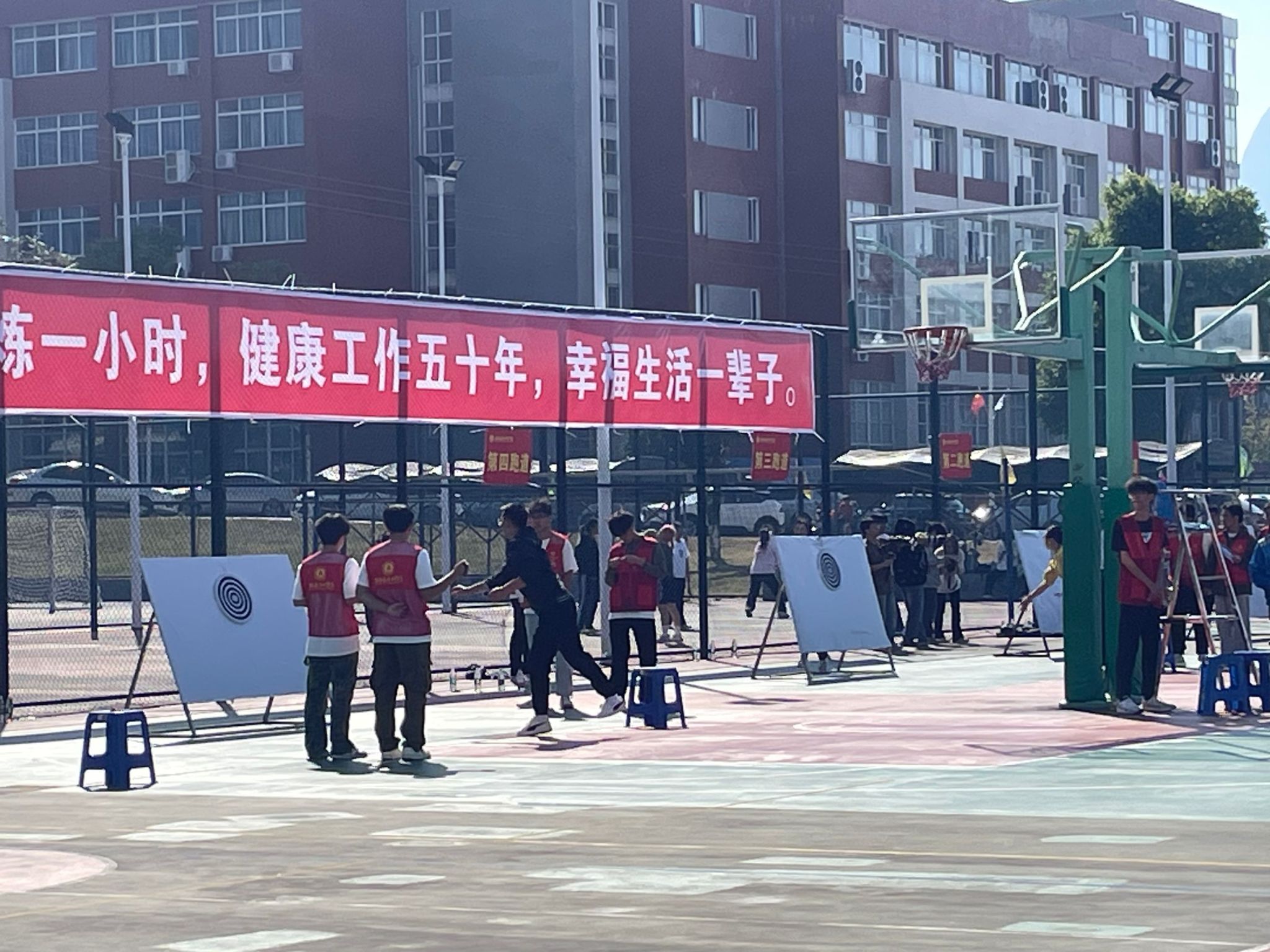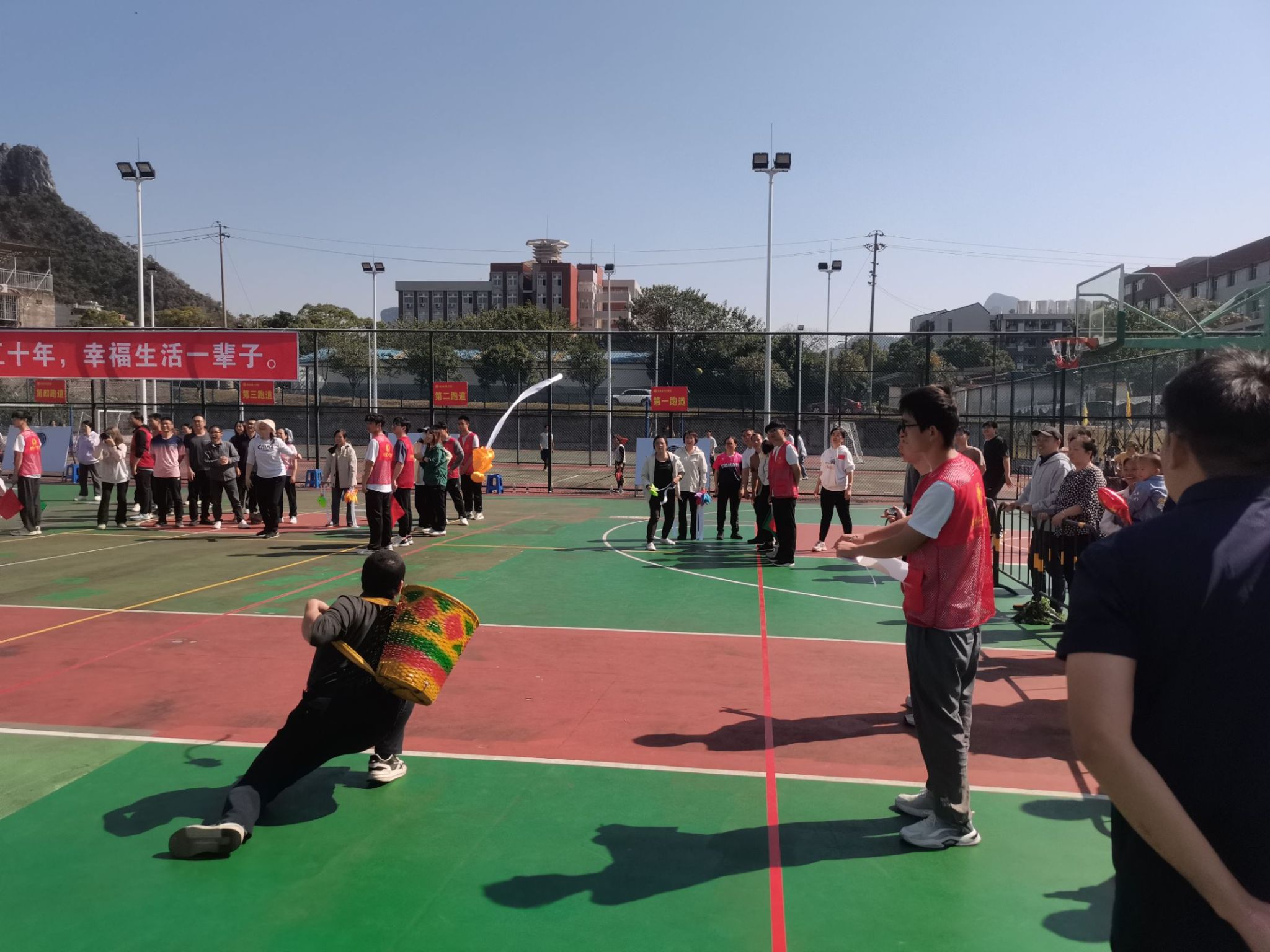 运动会共设置五个项目,首先是充满活力的“疯狂毛毛虫”,参赛队员们齐心协力骑着毛毛虫奋勇前行,场面热闹非凡。接着是紧张刺激的“飞镖接力比赛”,选手们全神贯注,一支支飞镖精准飞出,展现出高超的技巧。“众星捧月”项目中,大家紧密配合,共同托起象征着团结的“月亮”。“呼啦圈过山车”更是将速度与技巧完美结合,呼啦圈在队员们之间快速传递,犹如过山车般令人目不暇接。最后,“背篓抛绣球比赛”为运动会增添了一抹民族特色,彩色的绣球在空中飞舞,准确地落入背篓中,引来阵阵欢呼。