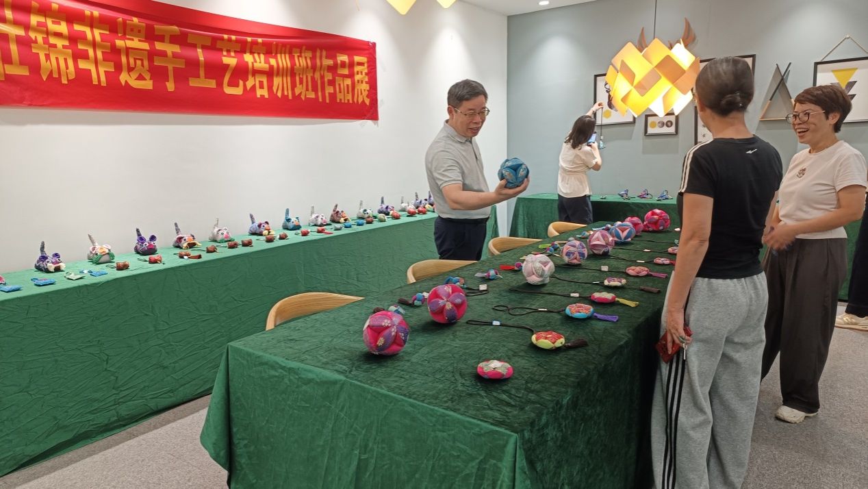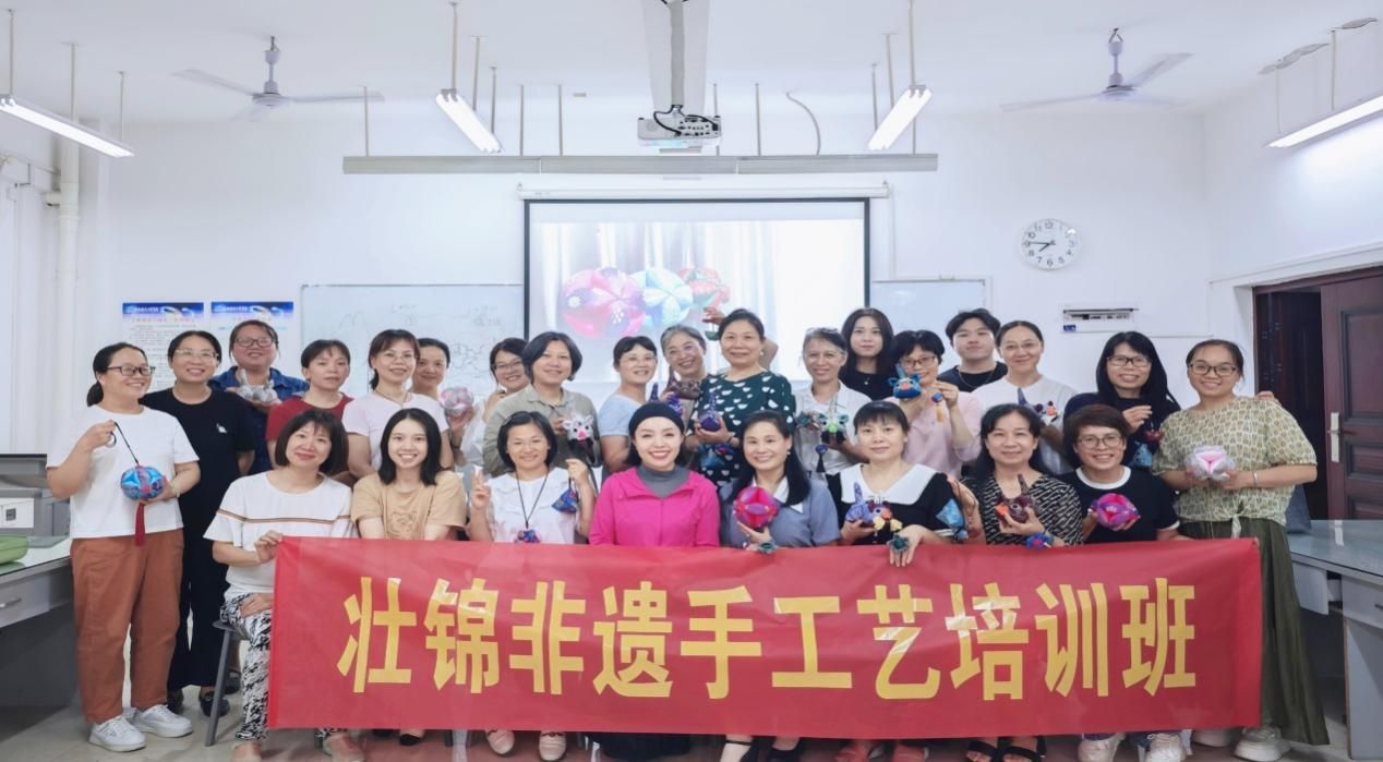 非遗手工制作班的老师引领大家深入领略传统技艺的独特魅力。在这门课程中,学员们不仅能学习制作精美手工艺品的方法,还能深入了解每件作品背后的文化故事及其制作工艺的传承。老师细致入微地讲解每一个步骤,从选材到成品,每个细节都彰显出匠人精神的精髓。通过亲身实践,学员们将更加深刻地体会到非物质文化遗产的深厚价值与意义。为展示大家的培训成果,特在飞天楼303举办为期一周的壮锦非遗手工艺作品展,让大家感受其悠久的历史底蕴与精湛的工艺之美。